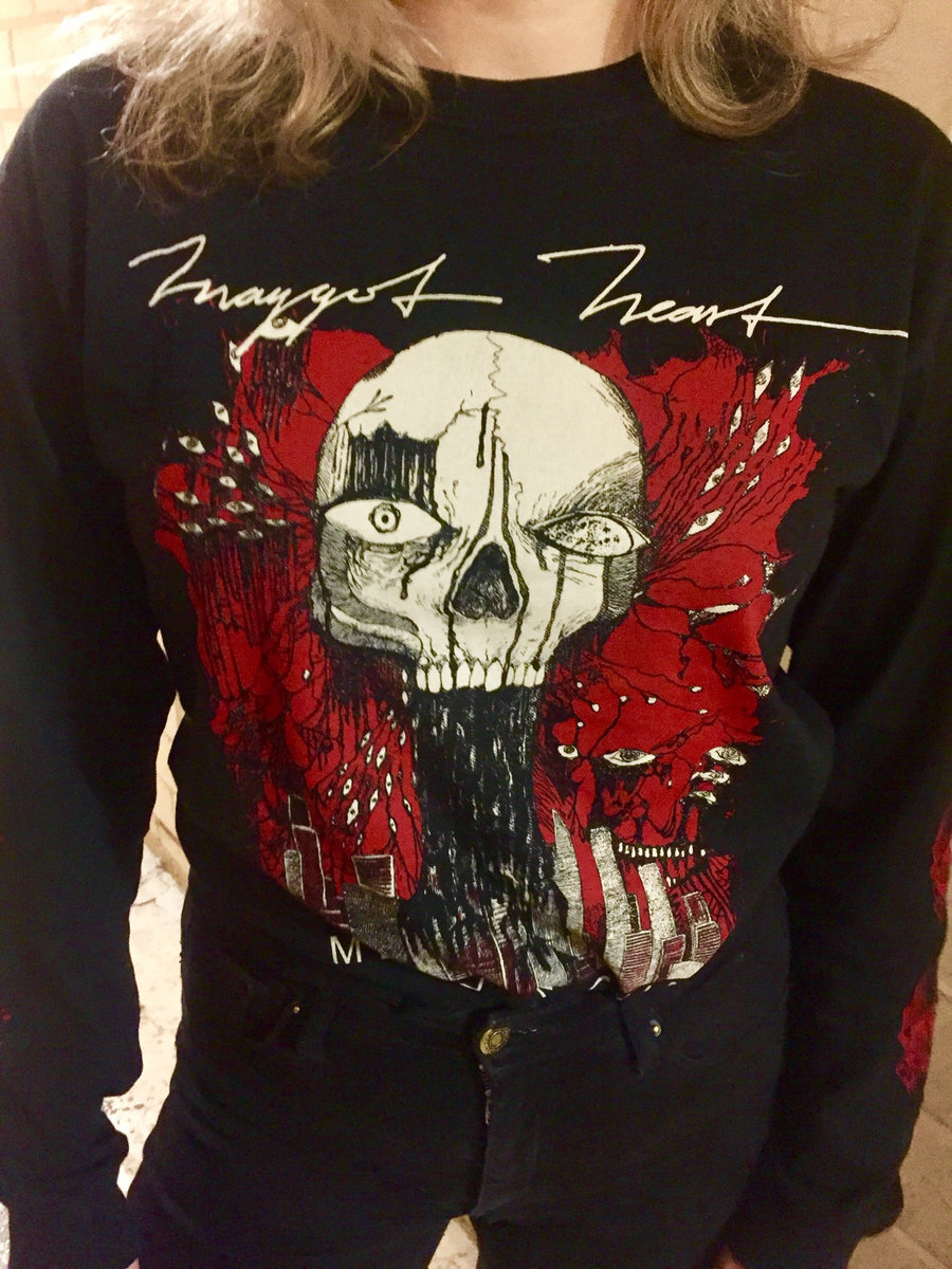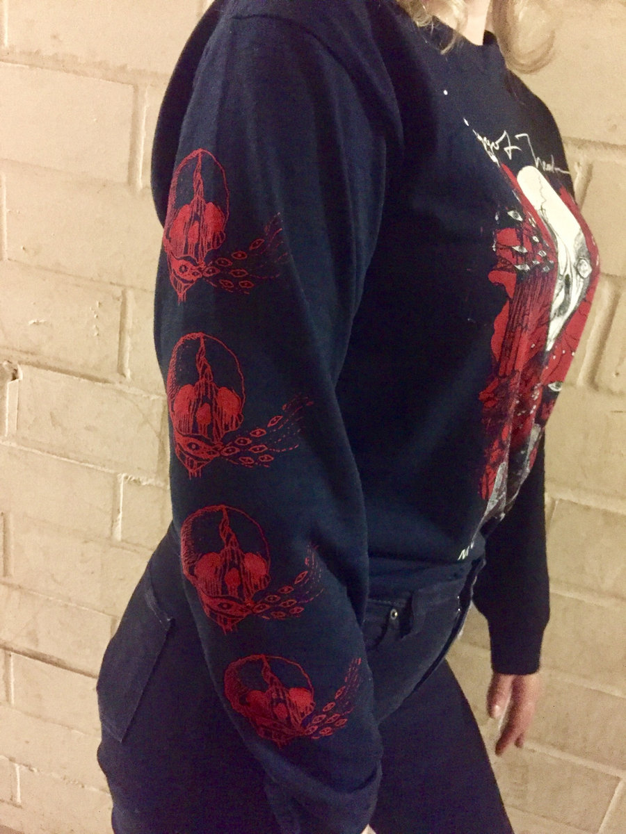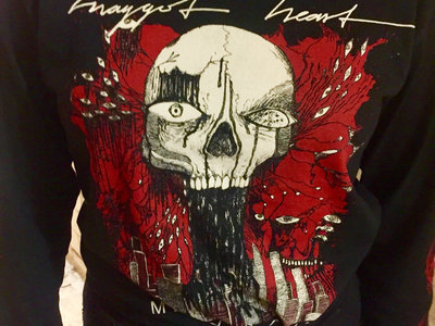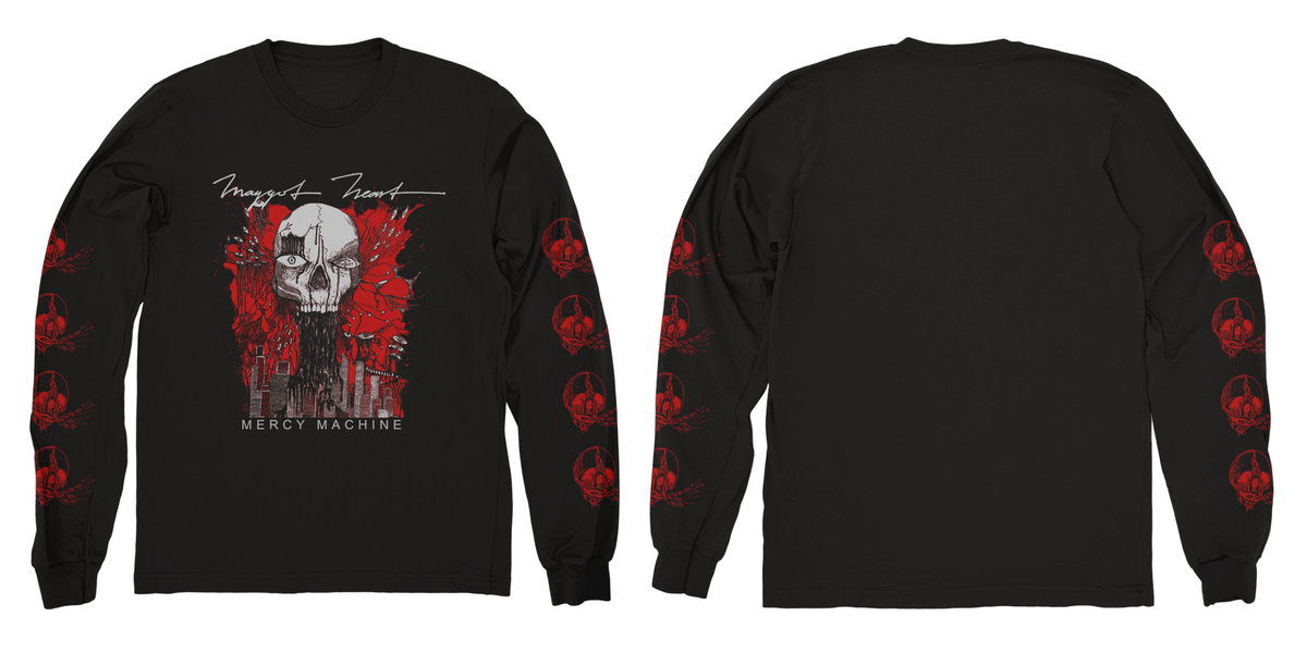Album artwork from "Mercy Machine" by Kristian Valbo on front and sleeves of this black Gildan longsleeve shirt.